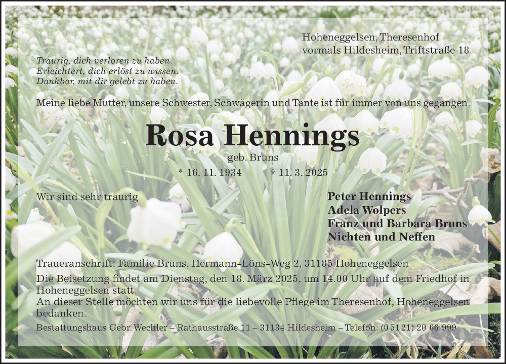 Hier finden Sie alle Traueranzeigen aus der Zeitung, die bisher für Rosa Hennings erschienen sind. Weitere Traueranzeigen, die in der Zeitung erscheinen, werden hier ebenfalls aufgelistet