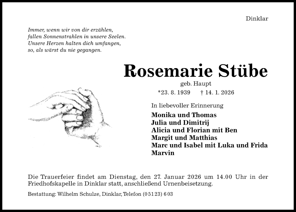 Hier finden Sie alle Traueranzeigen aus der Zeitung, die bisher für Rosemarie Stübe erschienen sind. Weitere Traueranzeigen, die in der Zeitung erscheinen, werden hier ebenfalls aufgelistet