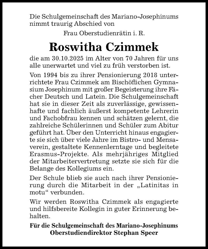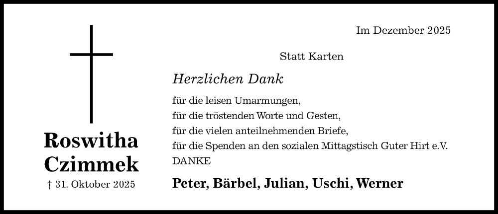 Hier finden Sie alle Traueranzeigen aus der Zeitung, die bisher für Roswitha Czimmek erschienen sind. Weitere Traueranzeigen, die in der Zeitung erscheinen, werden hier ebenfalls aufgelistet