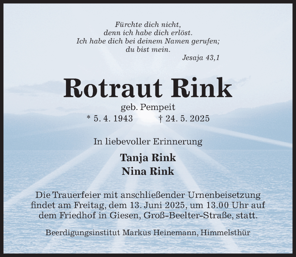 Hier finden Sie alle Traueranzeigen aus der Zeitung, die bisher für Rotraut Rink erschienen sind. Weitere Traueranzeigen, die in der Zeitung erscheinen, werden hier ebenfalls aufgelistet