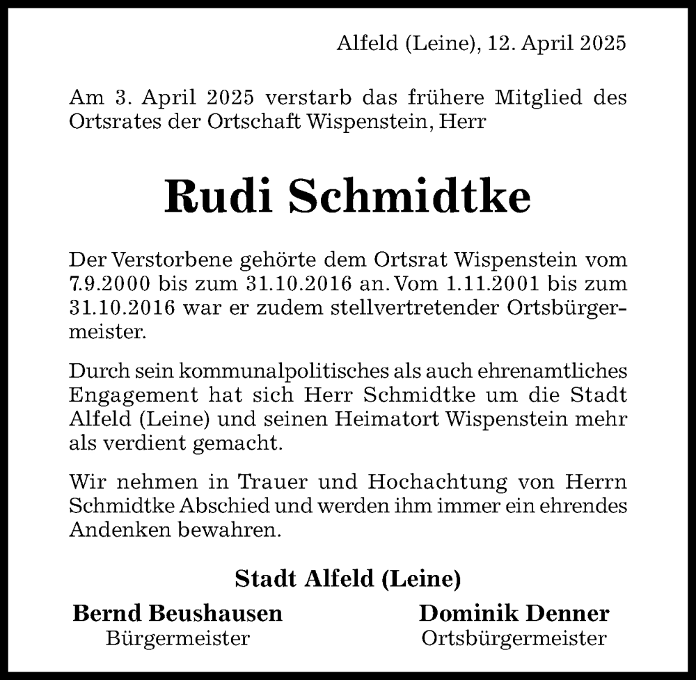 Hier finden Sie alle Traueranzeigen aus der Zeitung, die bisher für Rudi Schmidtke erschienen sind. Weitere Traueranzeigen, die in der Zeitung erscheinen, werden hier ebenfalls aufgelistet
