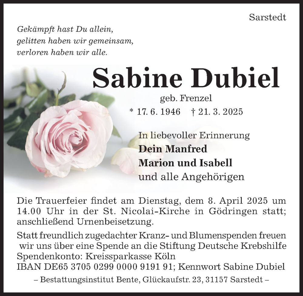 Hier finden Sie alle Traueranzeigen aus der Zeitung, die bisher für Sabine Dubiel erschienen sind. Weitere Traueranzeigen, die in der Zeitung erscheinen, werden hier ebenfalls aufgelistet