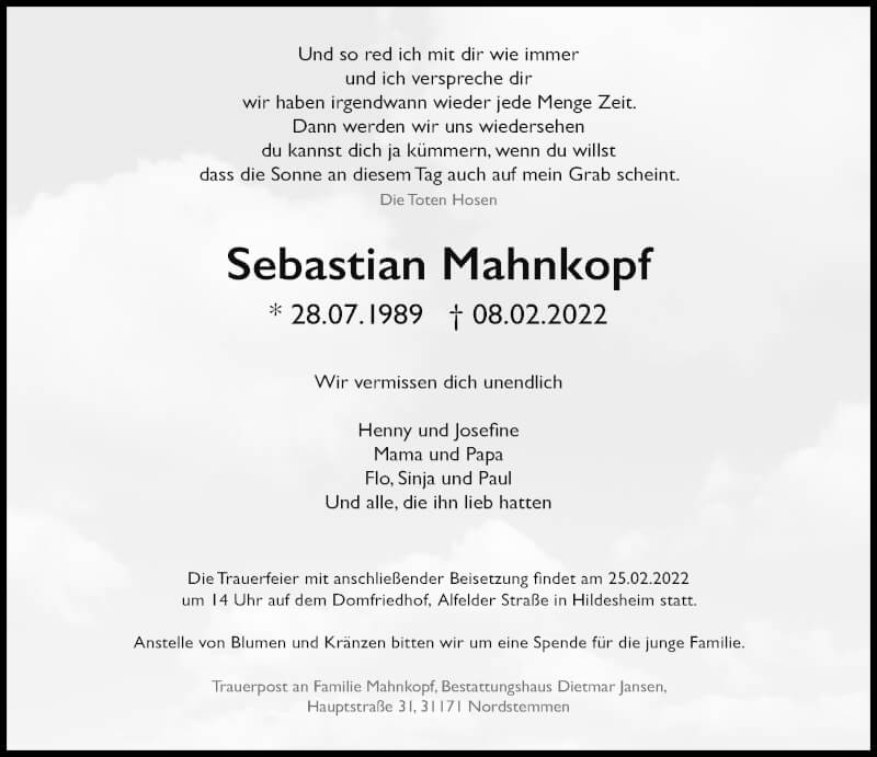 Hier finden Sie alle Traueranzeigen aus der Zeitung, die bisher für Sebastian Mahnkopf erschienen sind. Weitere Traueranzeigen, die in der Zeitung erscheinen, werden hier ebenfalls aufgelistet