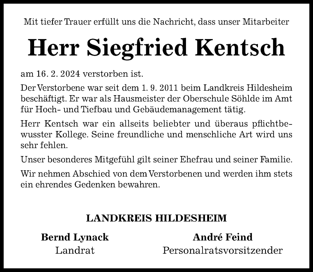 Hier finden Sie alle Traueranzeigen aus der Zeitung, die bisher für Siegfried Kentsch erschienen sind. Weitere Traueranzeigen, die in der Zeitung erscheinen, werden hier ebenfalls aufgelistet