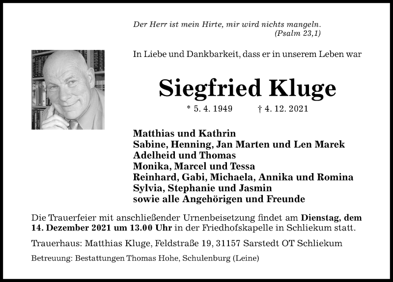 Hier finden Sie alle Traueranzeigen aus der Zeitung, die bisher für Siegfried Kluge erschienen sind. Weitere Traueranzeigen, die in der Zeitung erscheinen, werden hier ebenfalls aufgelistet