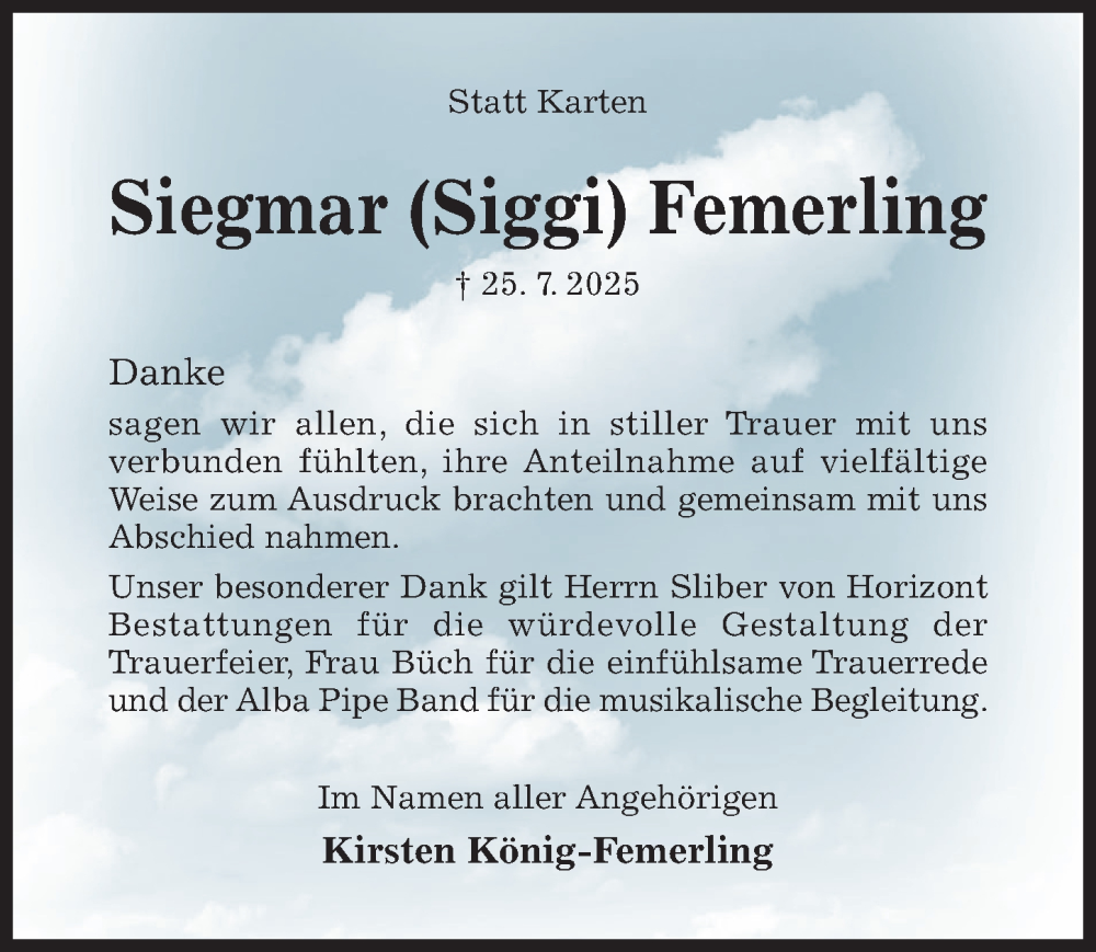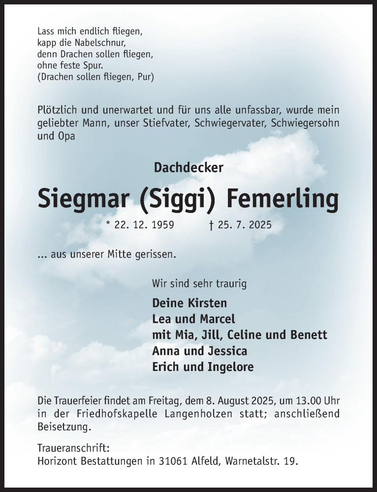 Hier finden Sie alle Traueranzeigen aus der Zeitung, die bisher für Siegmar Femerling erschienen sind. Weitere Traueranzeigen, die in der Zeitung erscheinen, werden hier ebenfalls aufgelistet