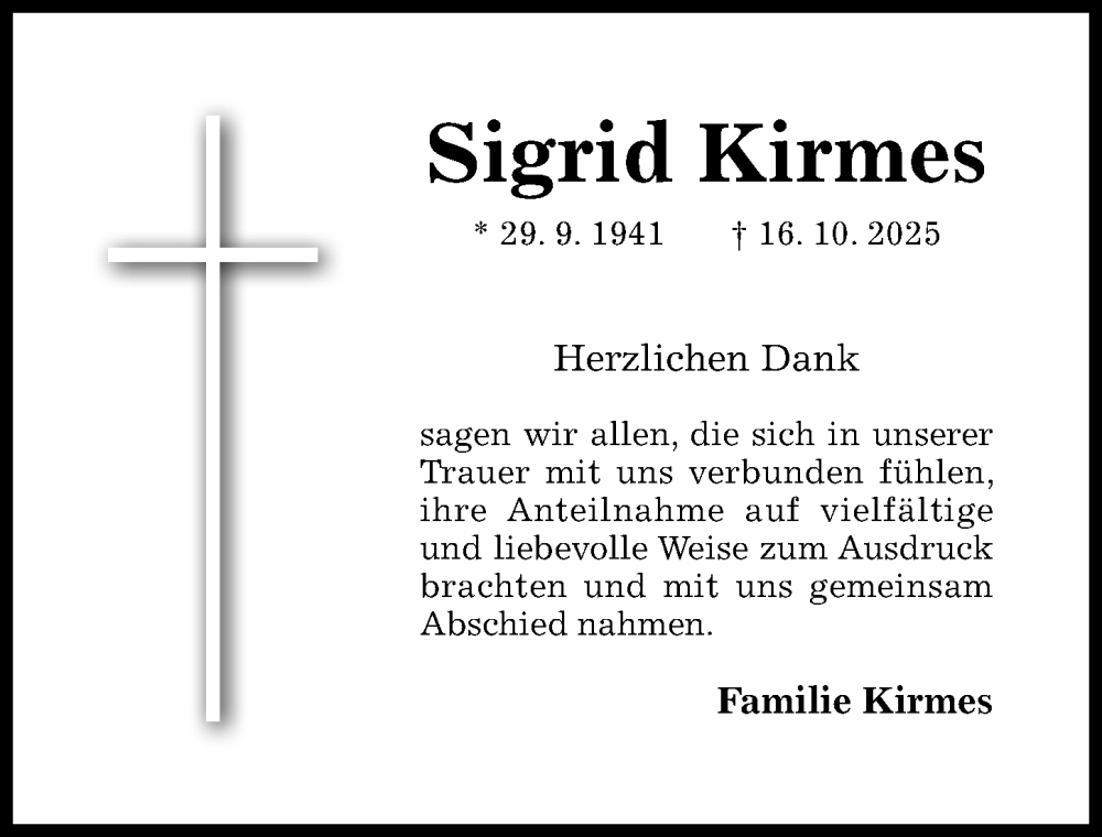 Hier finden Sie alle Traueranzeigen aus der Zeitung, die bisher für Sigrid Kirmes erschienen sind. Weitere Traueranzeigen, die in der Zeitung erscheinen, werden hier ebenfalls aufgelistet