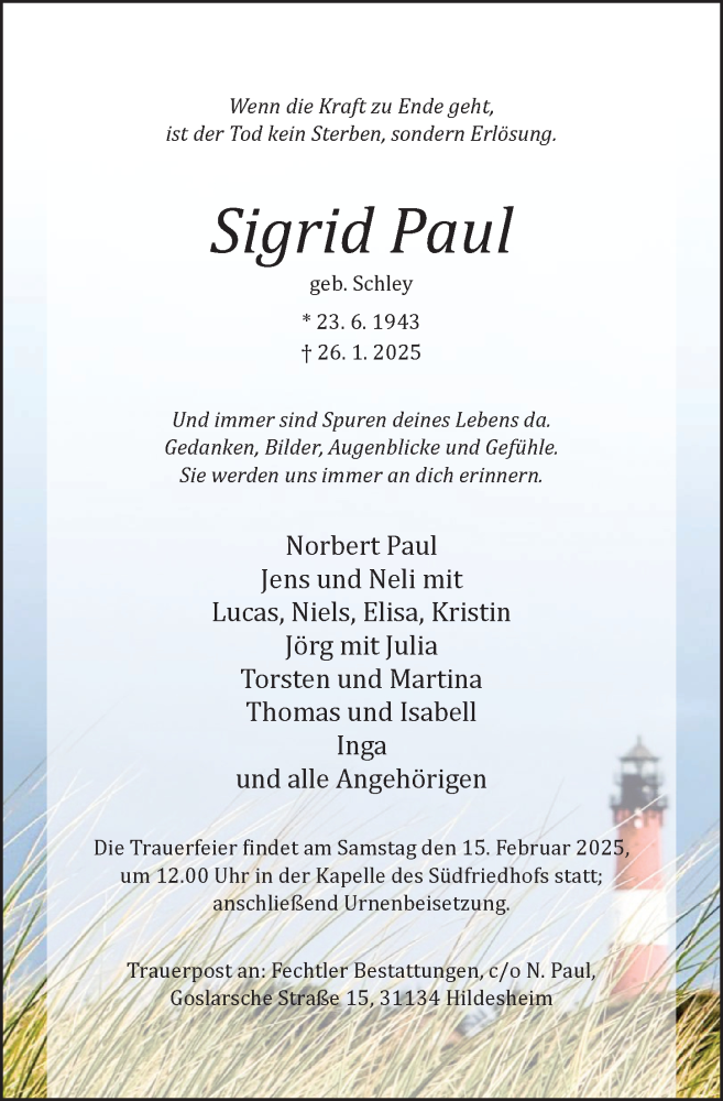 Hier finden Sie alle Traueranzeigen aus der Zeitung, die bisher für Sigrid Paul erschienen sind. Weitere Traueranzeigen, die in der Zeitung erscheinen, werden hier ebenfalls aufgelistet