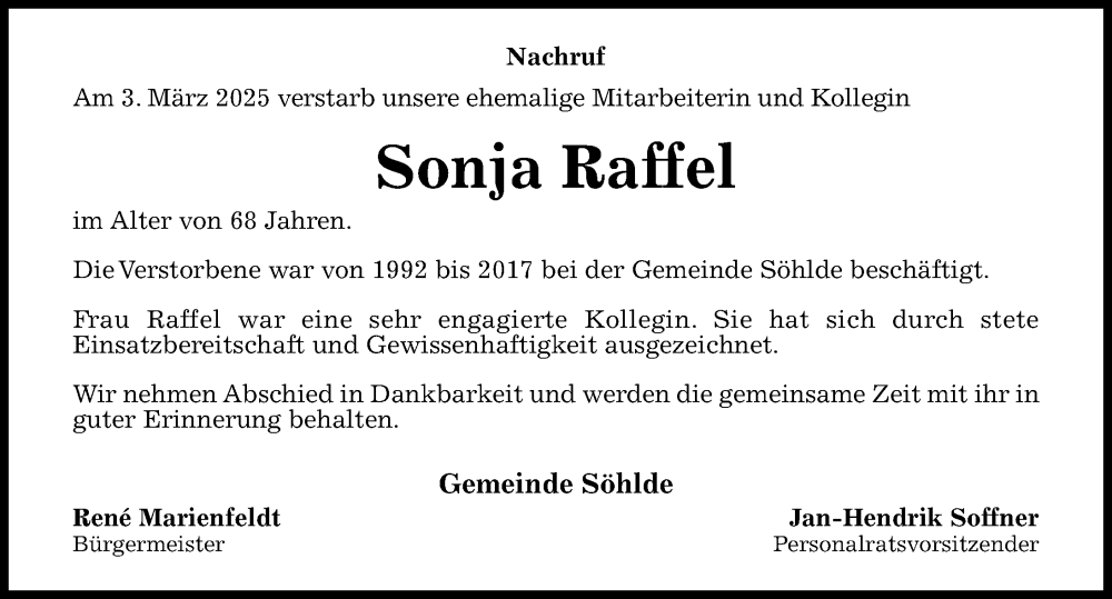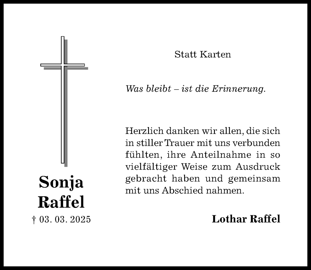 Hier finden Sie alle Traueranzeigen aus der Zeitung, die bisher für Sonja Raffel erschienen sind. Weitere Traueranzeigen, die in der Zeitung erscheinen, werden hier ebenfalls aufgelistet