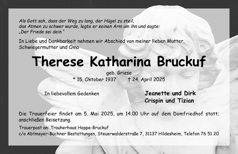Hier finden Sie alle Traueranzeigen aus der Zeitung, die bisher für Therese Katharina Bruckuf erschienen sind. Weitere Traueranzeigen, die in der Zeitung erscheinen, werden hier ebenfalls aufgelistet