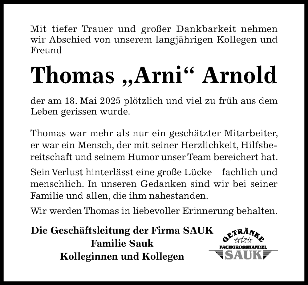 Hier finden Sie alle Traueranzeigen aus der Zeitung, die bisher für Thomas Arnold erschienen sind. Weitere Traueranzeigen, die in der Zeitung erscheinen, werden hier ebenfalls aufgelistet