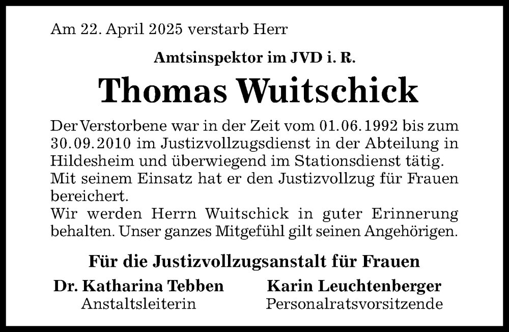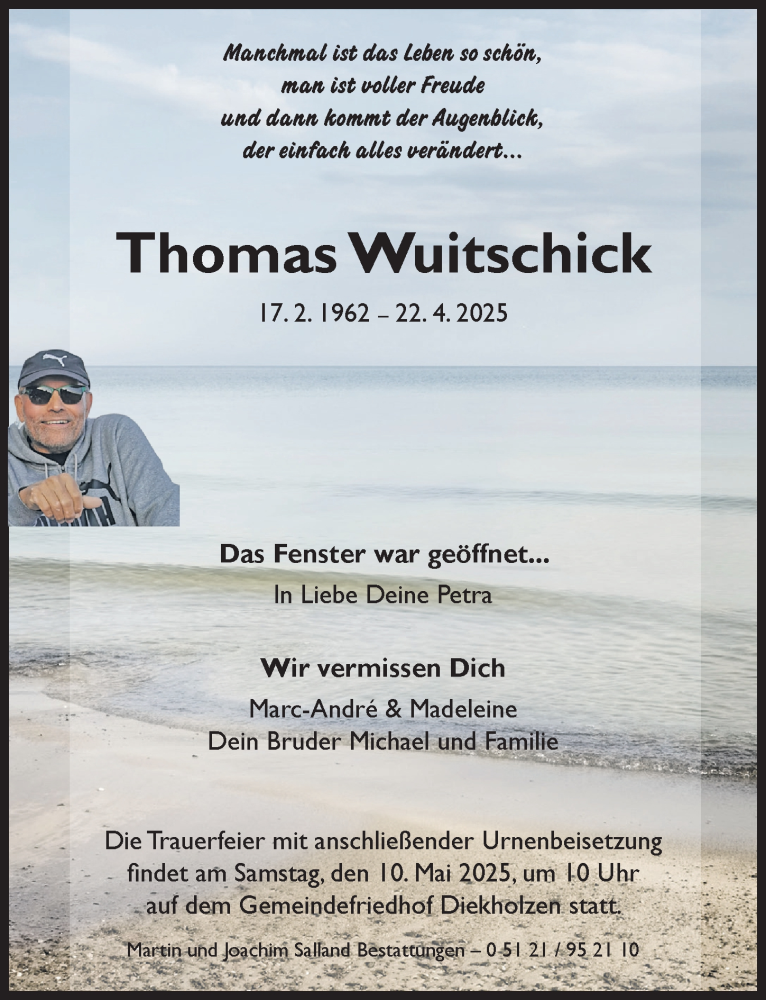 Hier finden Sie alle Traueranzeigen aus der Zeitung, die bisher für Thomas Wuitschick erschienen sind. Weitere Traueranzeigen, die in der Zeitung erscheinen, werden hier ebenfalls aufgelistet