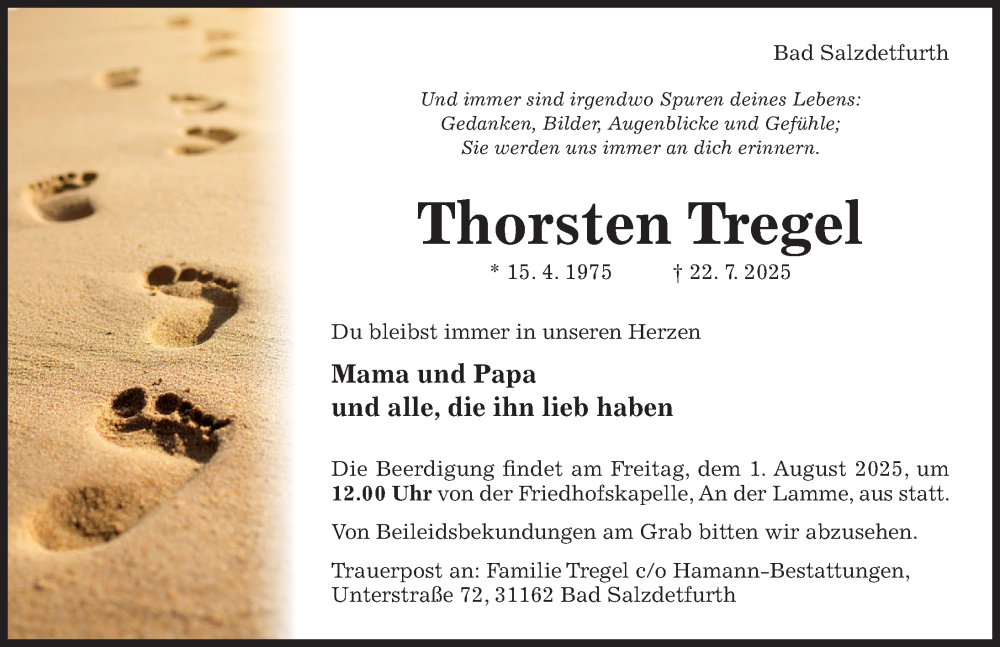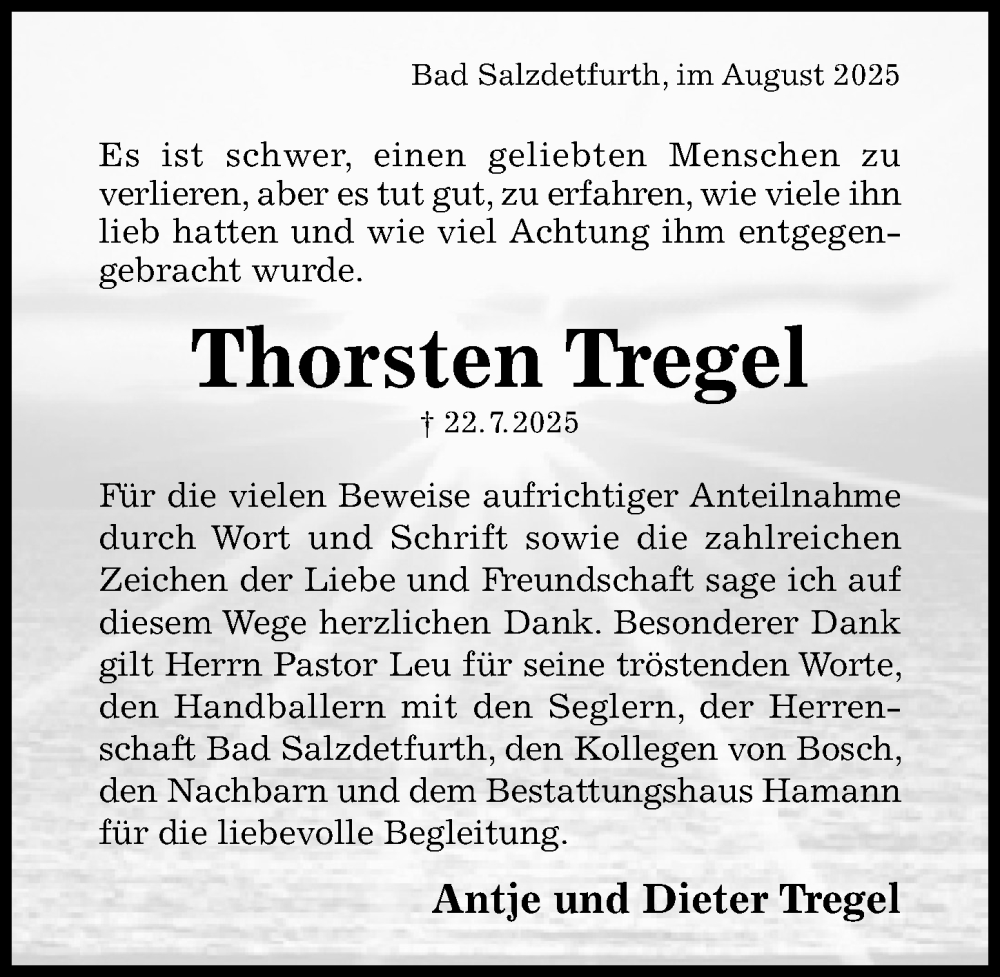 Hier finden Sie alle Traueranzeigen aus der Zeitung, die bisher für Thorsten Tregel erschienen sind. Weitere Traueranzeigen, die in der Zeitung erscheinen, werden hier ebenfalls aufgelistet