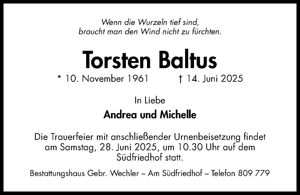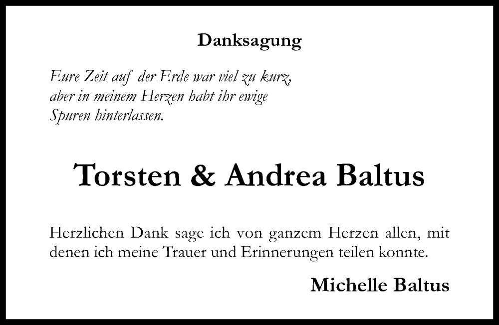 Hier finden Sie alle Traueranzeigen aus der Zeitung, die bisher für Torsten Baltus erschienen sind. Weitere Traueranzeigen, die in der Zeitung erscheinen, werden hier ebenfalls aufgelistet