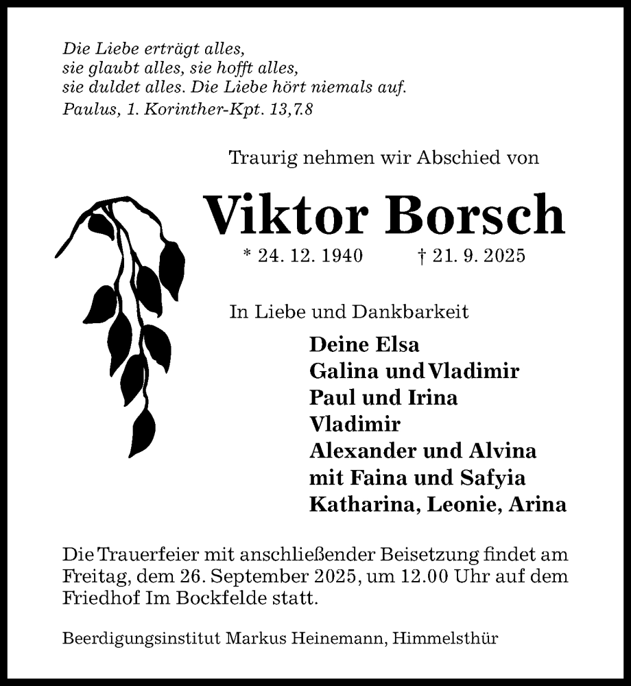 Hier finden Sie alle Traueranzeigen aus der Zeitung, die bisher für Viktor Borsch erschienen sind. Weitere Traueranzeigen, die in der Zeitung erscheinen, werden hier ebenfalls aufgelistet