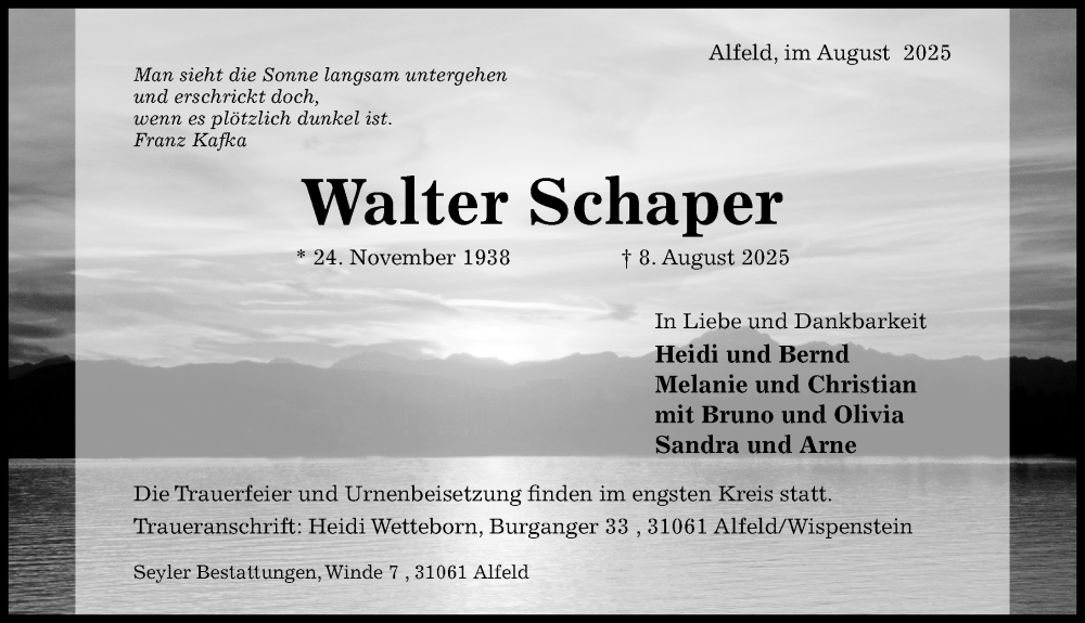 Hier finden Sie alle Traueranzeigen aus der Zeitung, die bisher für Walter Schaper erschienen sind. Weitere Traueranzeigen, die in der Zeitung erscheinen, werden hier ebenfalls aufgelistet
