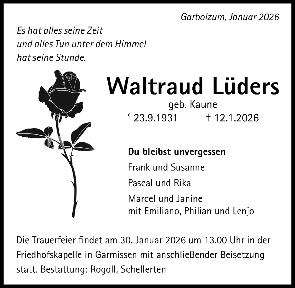 Hier finden Sie alle Traueranzeigen aus der Zeitung, die bisher für Waltraud Lüders erschienen sind. Weitere Traueranzeigen, die in der Zeitung erscheinen, werden hier ebenfalls aufgelistet