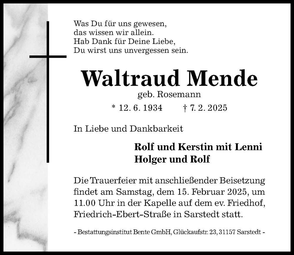 Hier finden Sie alle Traueranzeigen aus der Zeitung, die bisher für Waltraud Mende erschienen sind. Weitere Traueranzeigen, die in der Zeitung erscheinen, werden hier ebenfalls aufgelistet