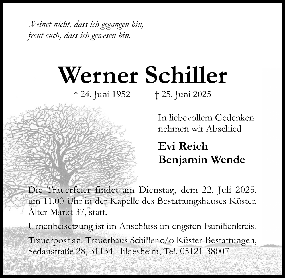 Hier finden Sie alle Traueranzeigen aus der Zeitung, die bisher für Werner Schiller erschienen sind. Weitere Traueranzeigen, die in der Zeitung erscheinen, werden hier ebenfalls aufgelistet