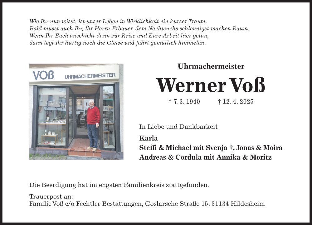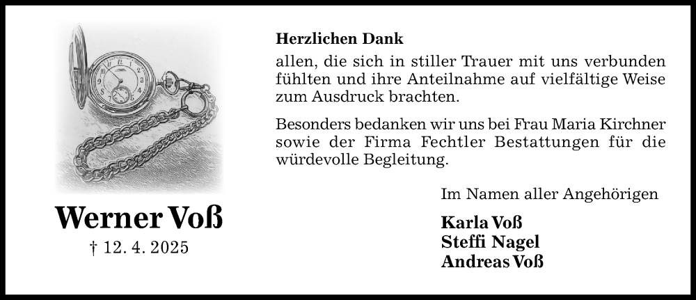 Hier finden Sie alle Traueranzeigen aus der Zeitung, die bisher für Werner Voß erschienen sind. Weitere Traueranzeigen, die in der Zeitung erscheinen, werden hier ebenfalls aufgelistet