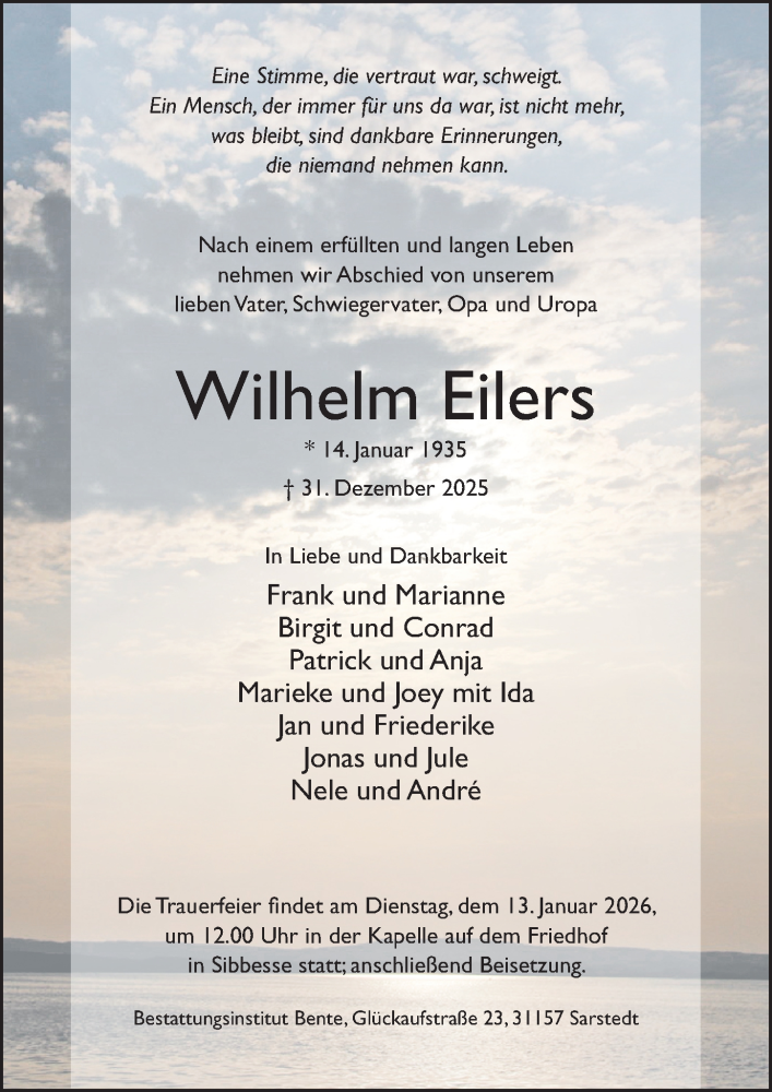 Hier finden Sie alle Traueranzeigen aus der Zeitung, die bisher für Wilhelm Eilers erschienen sind. Weitere Traueranzeigen, die in der Zeitung erscheinen, werden hier ebenfalls aufgelistet