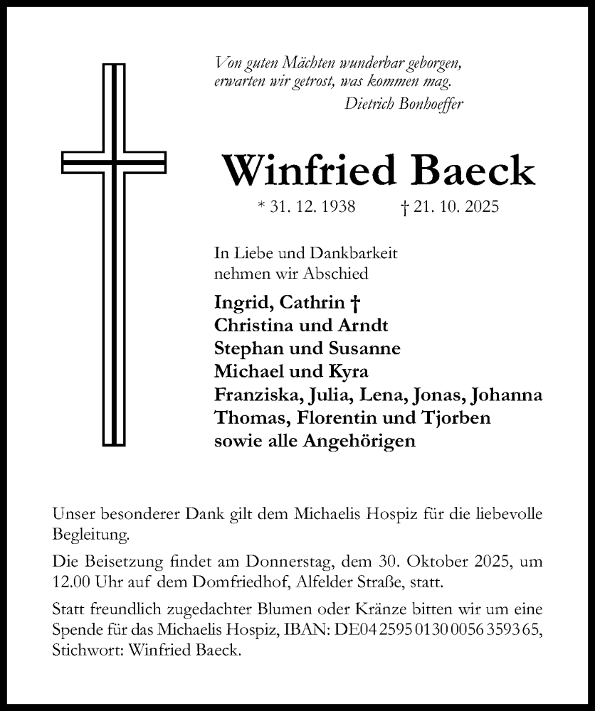 Hier finden Sie alle Traueranzeigen aus der Zeitung, die bisher für Winfried Baeck erschienen sind. Weitere Traueranzeigen, die in der Zeitung erscheinen, werden hier ebenfalls aufgelistet