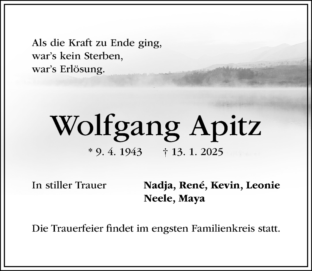 Hier finden Sie alle Traueranzeigen aus der Zeitung, die bisher für Wolfgang Apitz erschienen sind. Weitere Traueranzeigen, die in der Zeitung erscheinen, werden hier ebenfalls aufgelistet