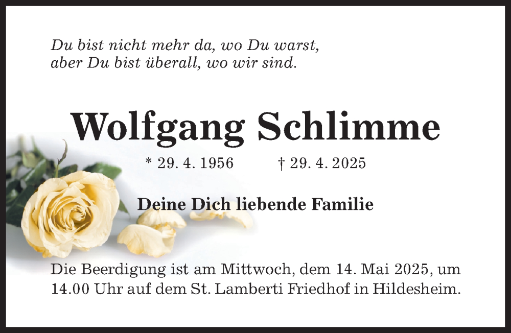 Hier finden Sie alle Traueranzeigen aus der Zeitung, die bisher für Wolfgang Schlimme erschienen sind. Weitere Traueranzeigen, die in der Zeitung erscheinen, werden hier ebenfalls aufgelistet