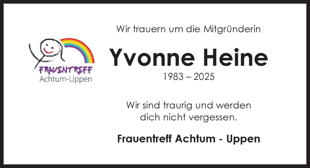 Hier finden Sie alle Traueranzeigen aus der Zeitung, die bisher für Yvonne Heine erschienen sind. Weitere Traueranzeigen, die in der Zeitung erscheinen, werden hier ebenfalls aufgelistet